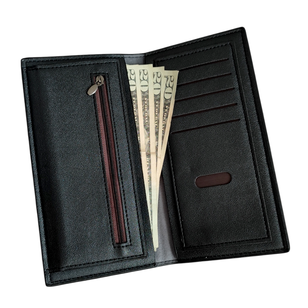La Goliat Wallet es una billetera espaciosa para mujer con capacidad para 10 tarjetas, dos compartimentos horizontales para billetes y un bolsillo con cierre para monedas. Perfecta para mantener todo organizado con un toque de elegancia.