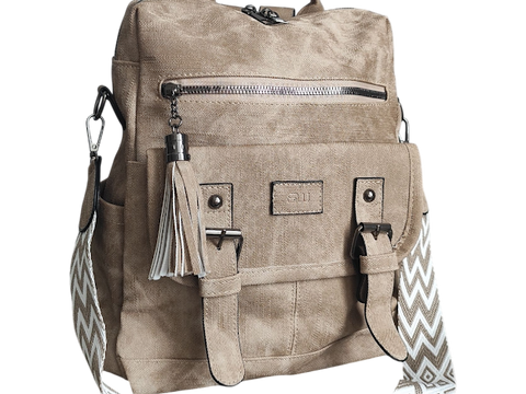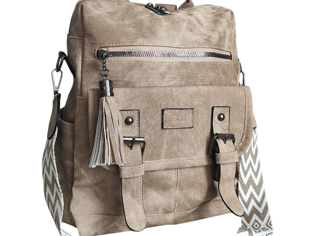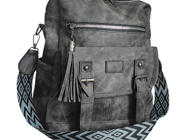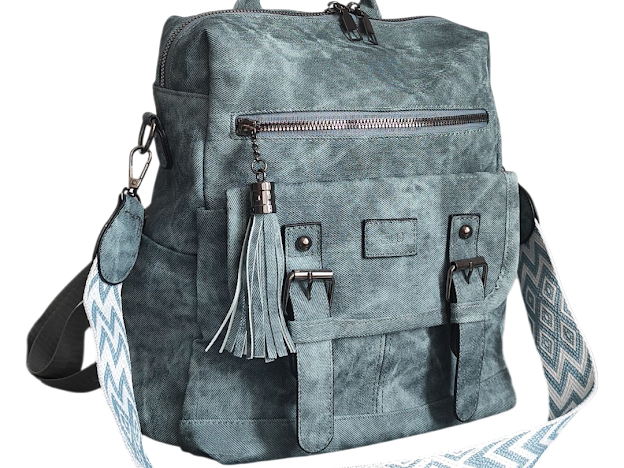 Mochila elegante de mujer con textura de jeans, correas ajustables y diseño espacioso. Cuenta con múltiples compartimentos para tus objetos personales y espacio adaptado para llevar tu laptop con comodidad y estilo.